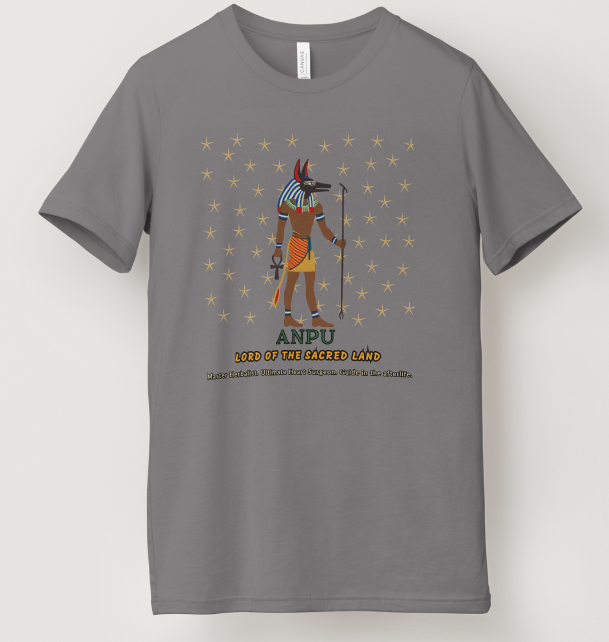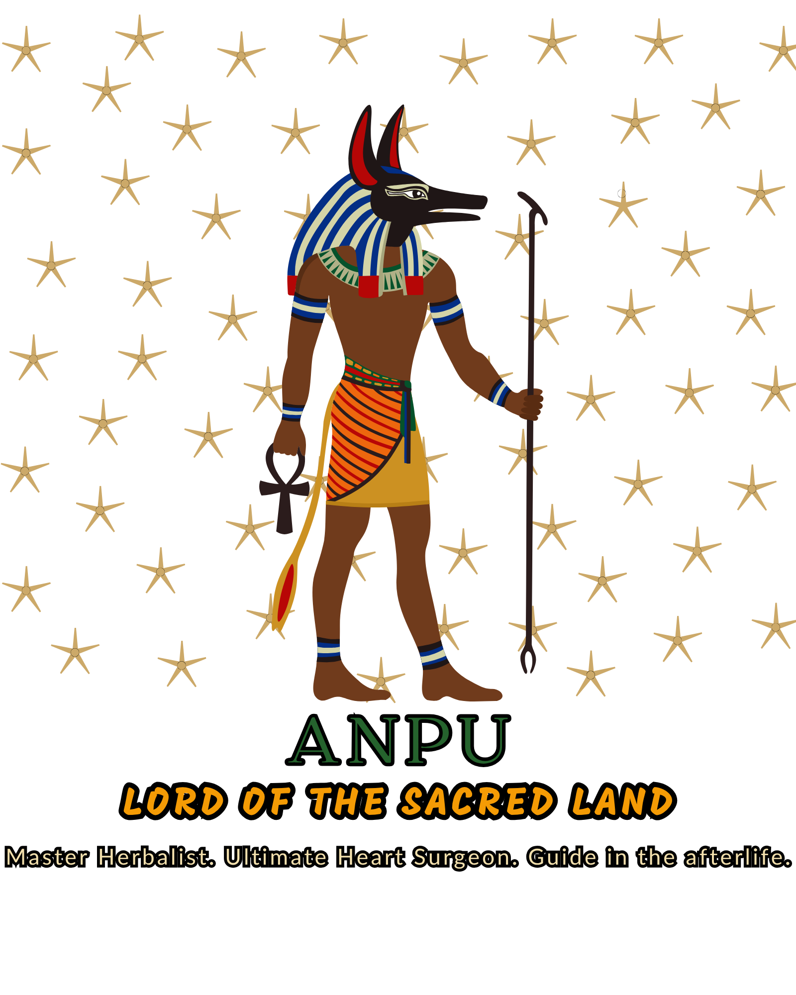 Description: Printed graphic design of the Neter, Anpu holding the Was Scepter (a symbol of power, dominion, and divine authority) in one hand and an Ankh (a symbol of life) in the other, with Seba stars in background. Meaning of the name: Lord of the Sacred Land. Known for being: Master Herbalist. Ultimate Heart Surgeon. Guide in the afterlife.