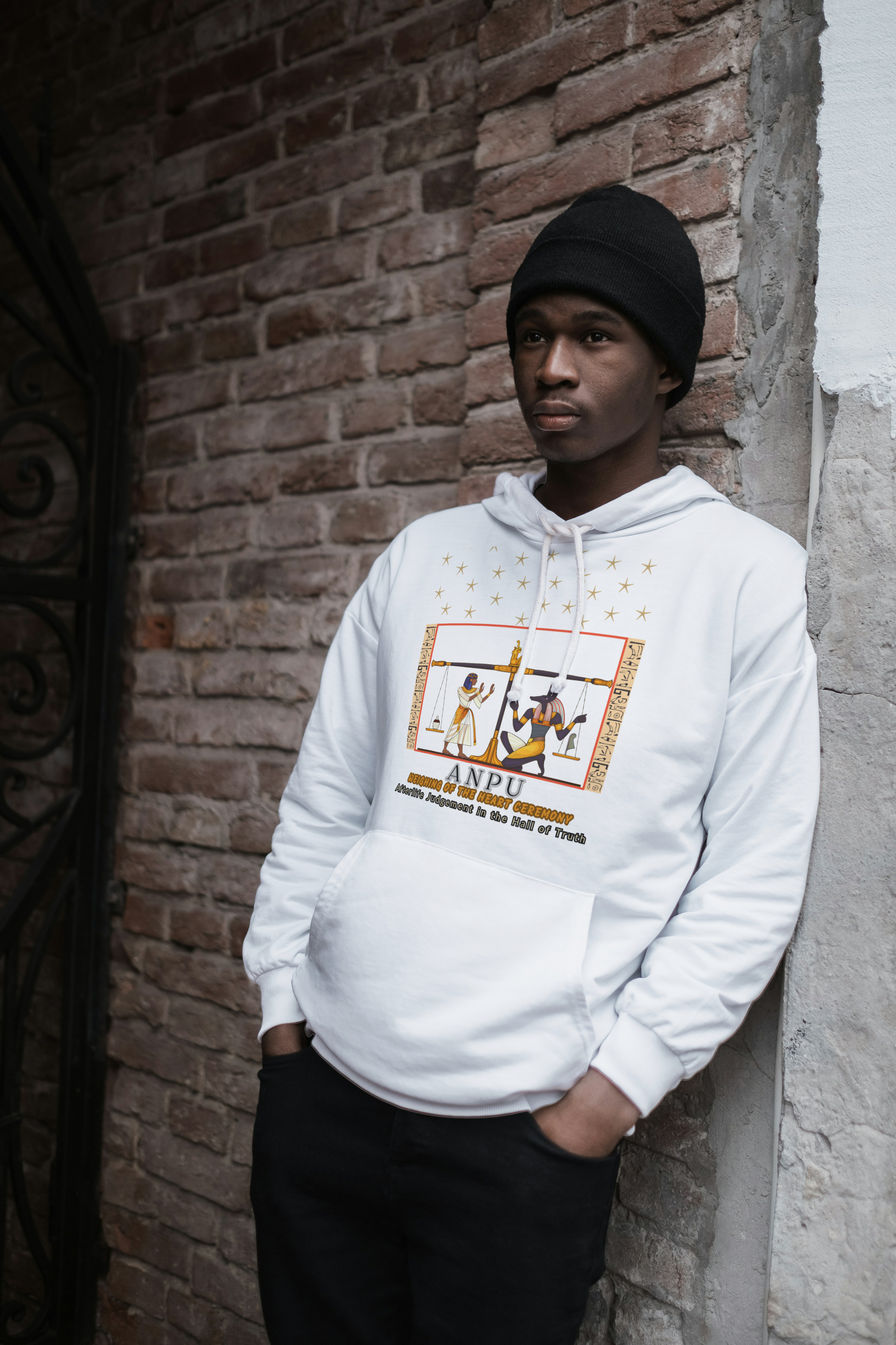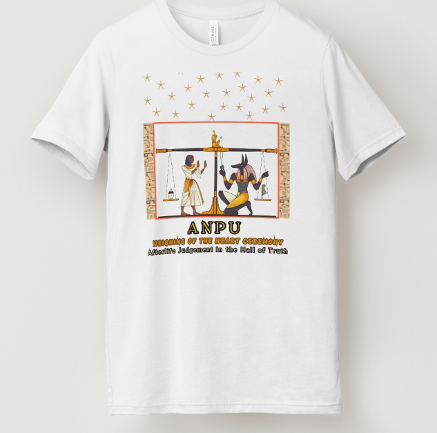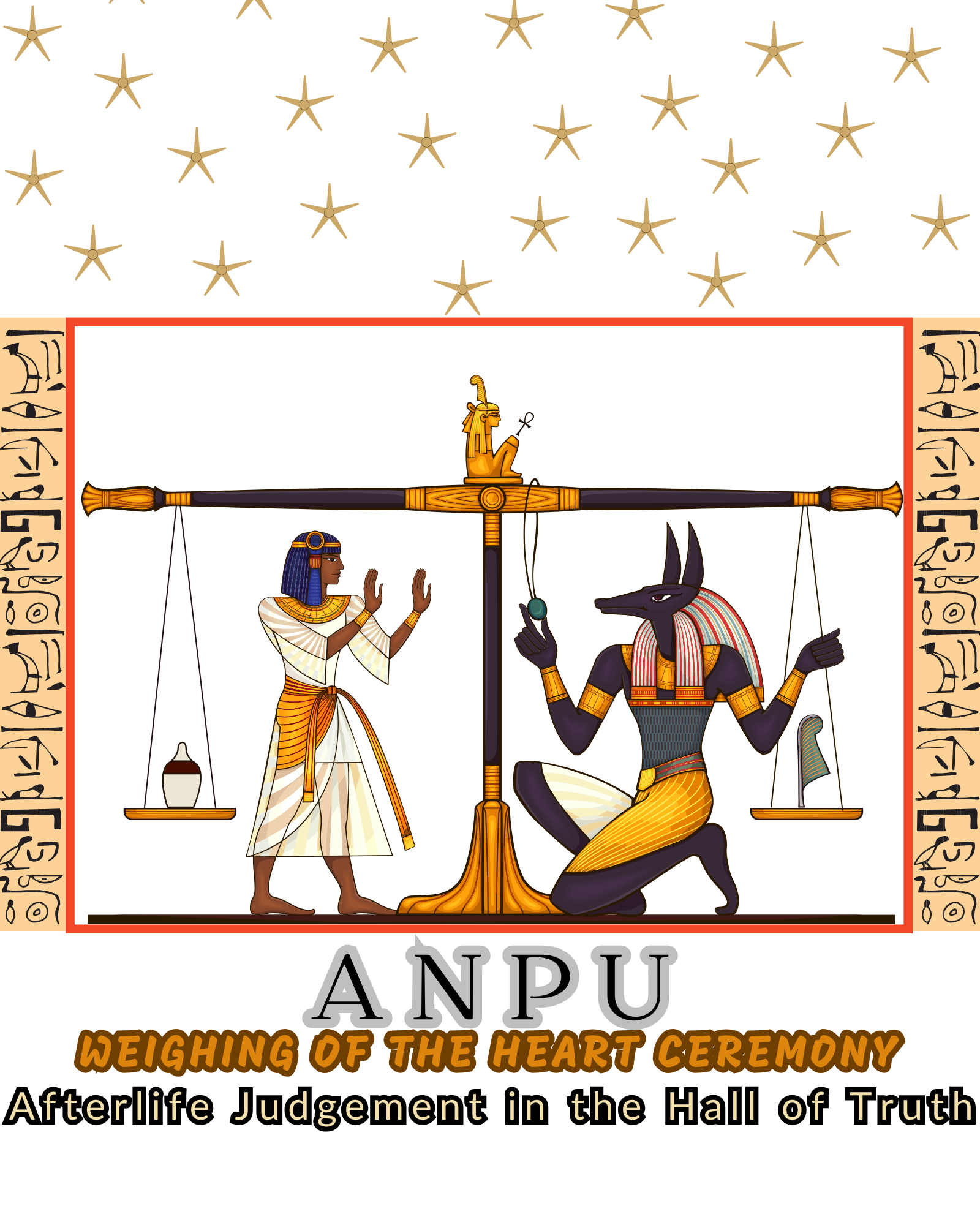Description: Printed graphic image of the Neter, Anpu at the Weighing of the Heart Ceremony. Significance: this scene depicts the Afterlife Judgement in the Hall of Truth, where one's heart is weighed against the feather of Maat. If the heart is lighter than the feather, signifying a life lived in accordance with Ma'at (truth and balance), the soul is deemed justified and allowed to pass into the Field of Reeds, a paradise-like realm.
