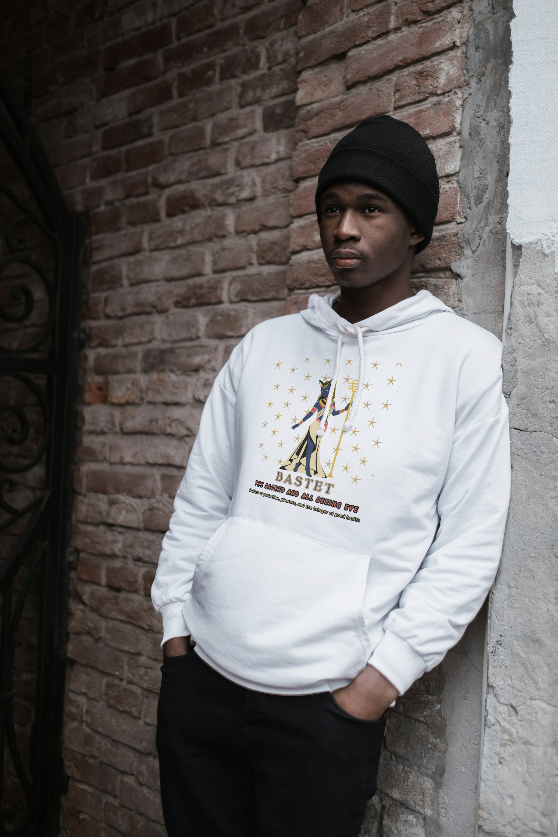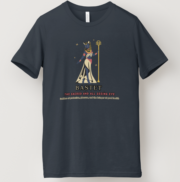 Description: Printed graphic design of Bastet in feminine dress, holding a sistrum (vibrational healing tool) with Seba stars background. Meaning of her name: the Sacred and All Seeing Eye. Known as: Goddess of protection, pleasure, and the bringer of good health