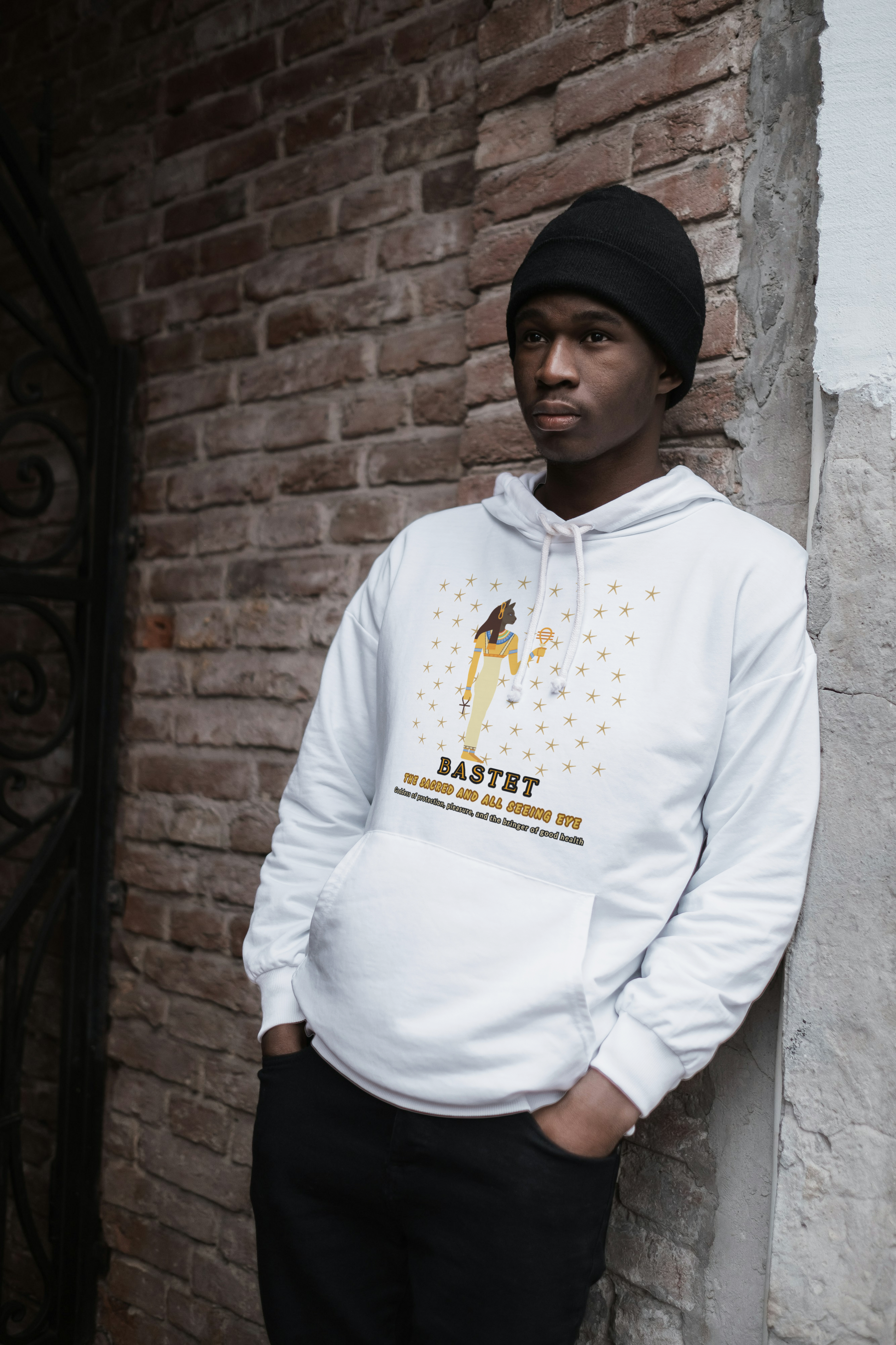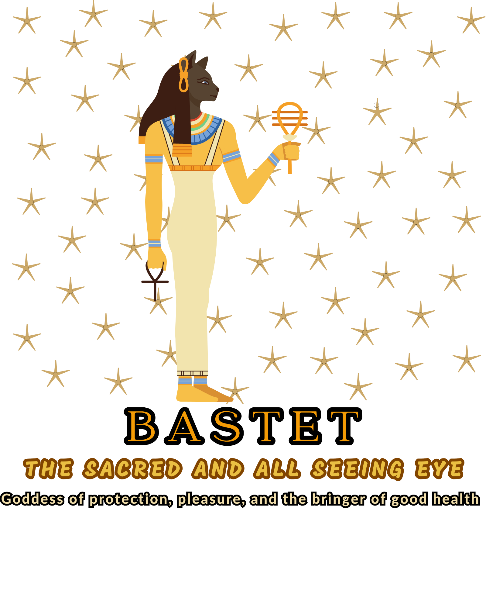 Description: Printed graphic design of the Neter, Bastet in feminine dress, holding a sistrum (vibrational healing tool) with Seba stars background. Meaning of her name: the Sacred and All Seeing Eye. Known as: Goddess of protection, pleasure, and the bringer of good health.