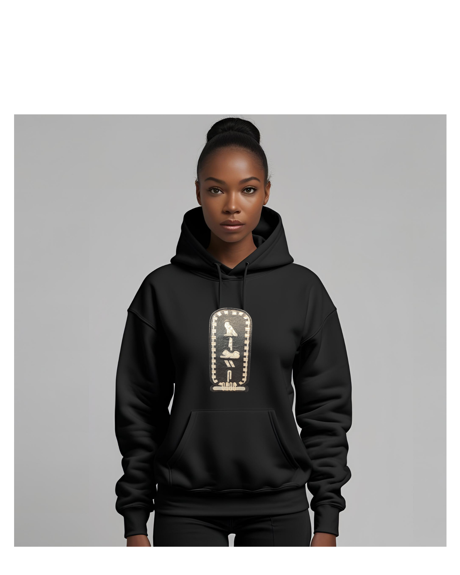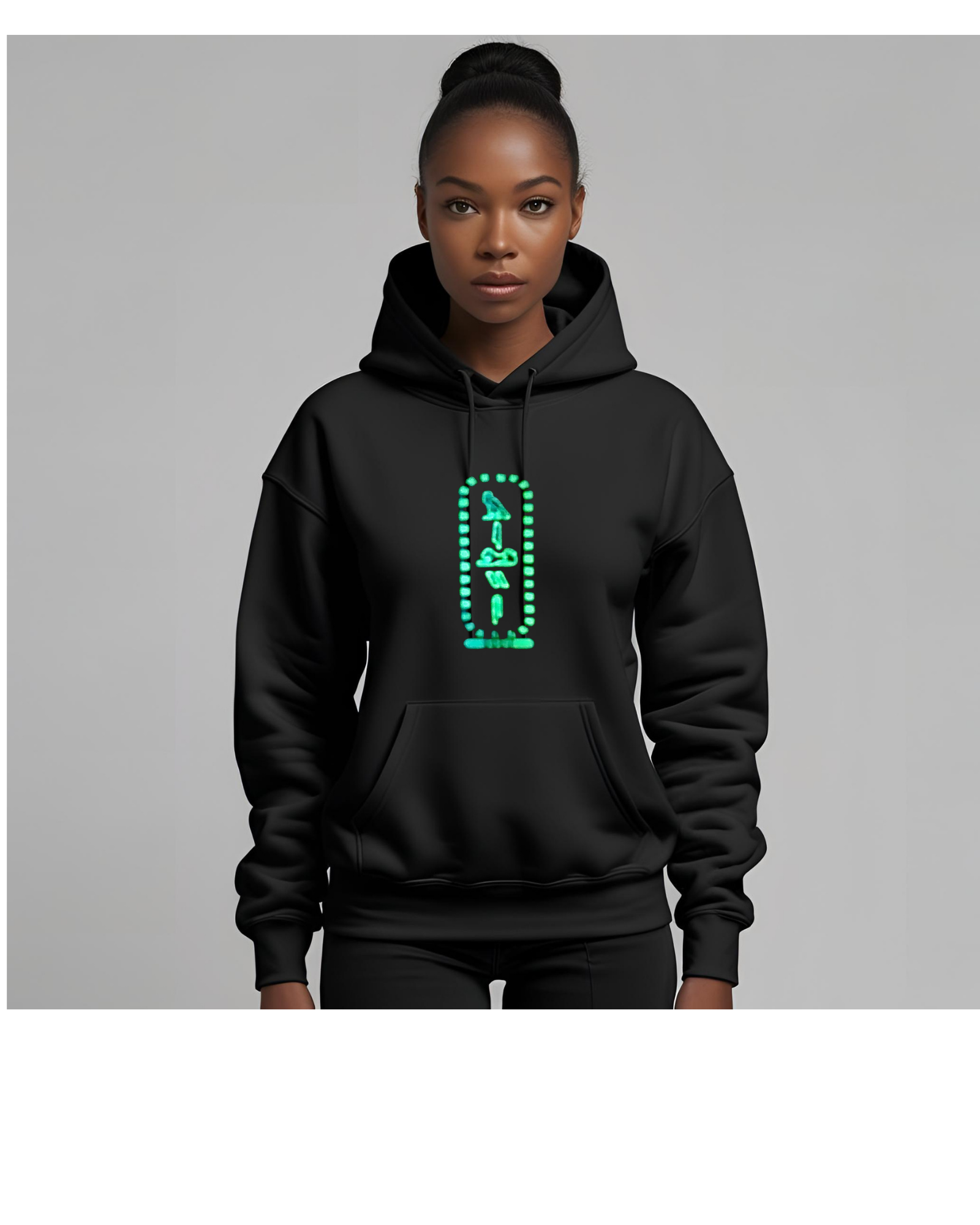 Personalize this image by having your name written the Medu Neter (Egyptian hieroglyphs). Customize the shirt by choosing the hoodie color, shenu background color, 2-3 thread colors for your name, and the thread type (solid, variegated, glow in the dark, or a combination of each). Your shirt will be customized and will have different hieroglyphs than what is shown in this image. If you prefer to have the image without a name, please note that at checkout.
