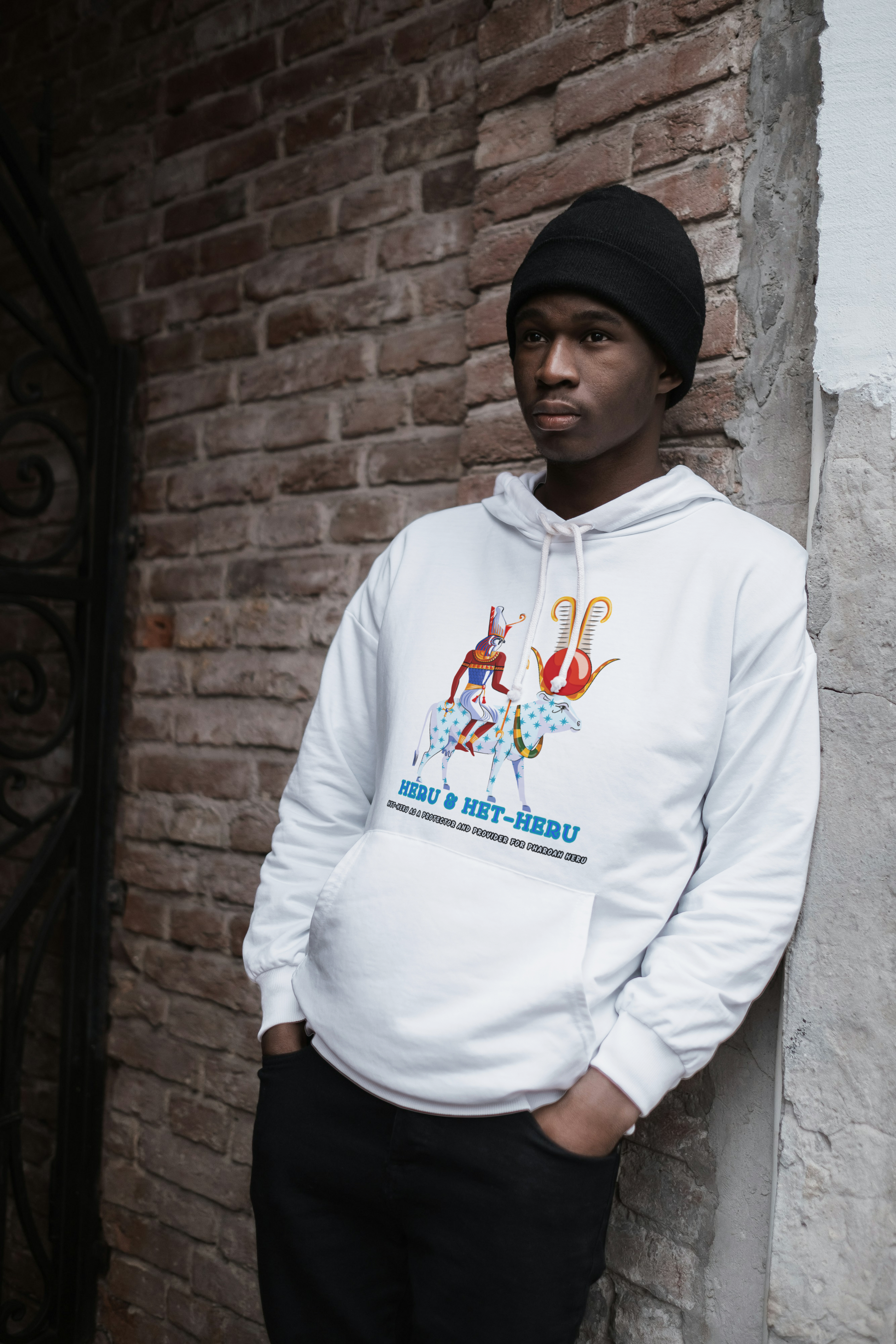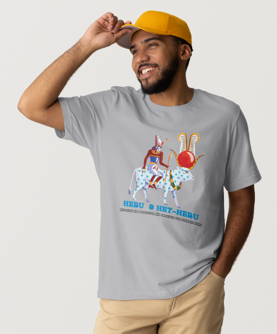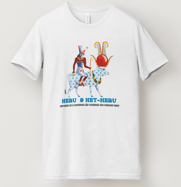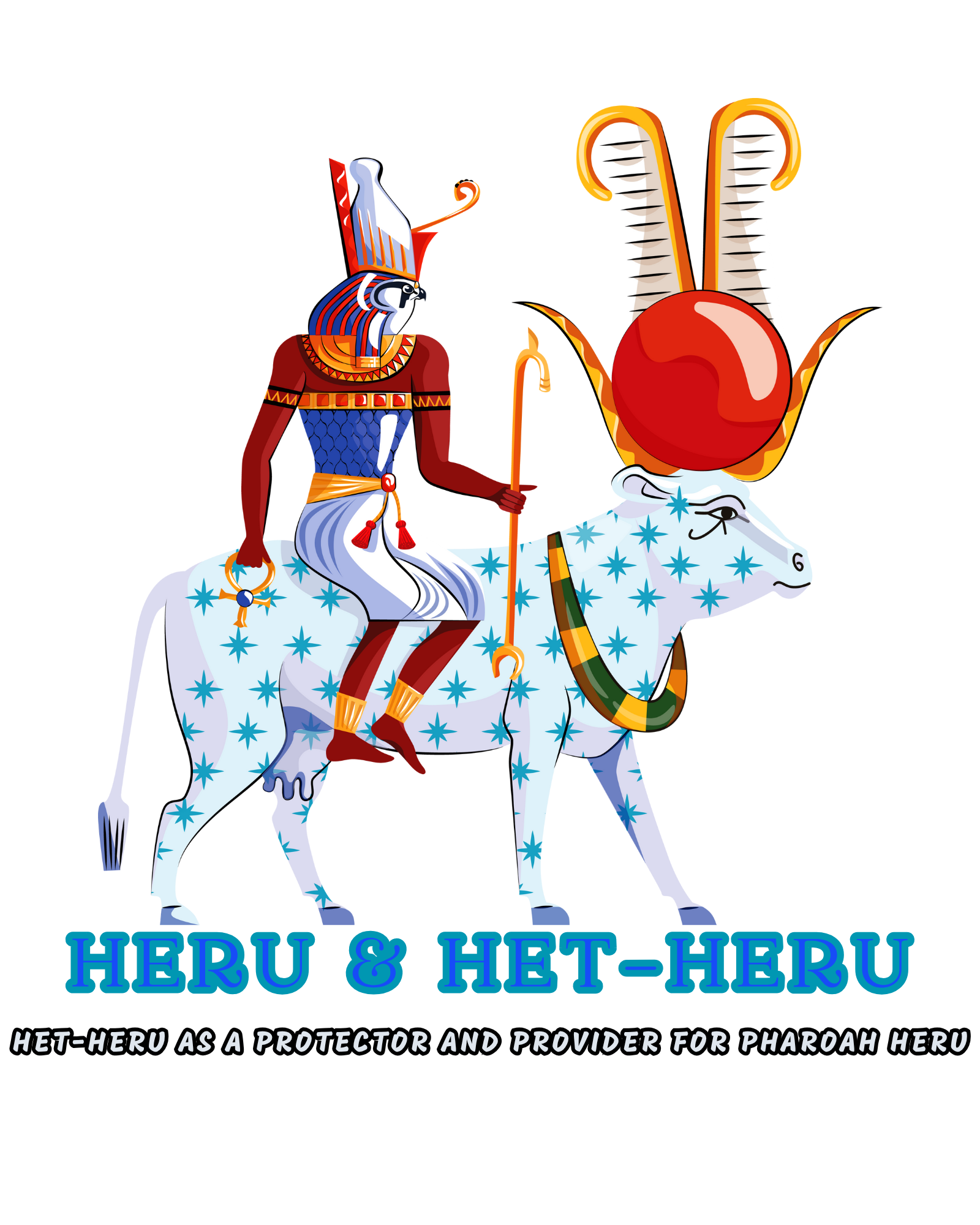 Description: Printed graphic design of Pharoah Heru holding the Was Scepter (a symbol of power, dominion, and divine authority) in one hand and the ankh (representing life) in the other while riding on the back of Neter, Het-Heru (as cow zootype). Meaning of image: Neter Het-Heru will protect and provide for the Pharoah and the kingdom under his rulership. Het- Heru in cow form represents her providing nourishment (what milk provides) so the land and kingdom with be fertile and prosperous with her divine protection.