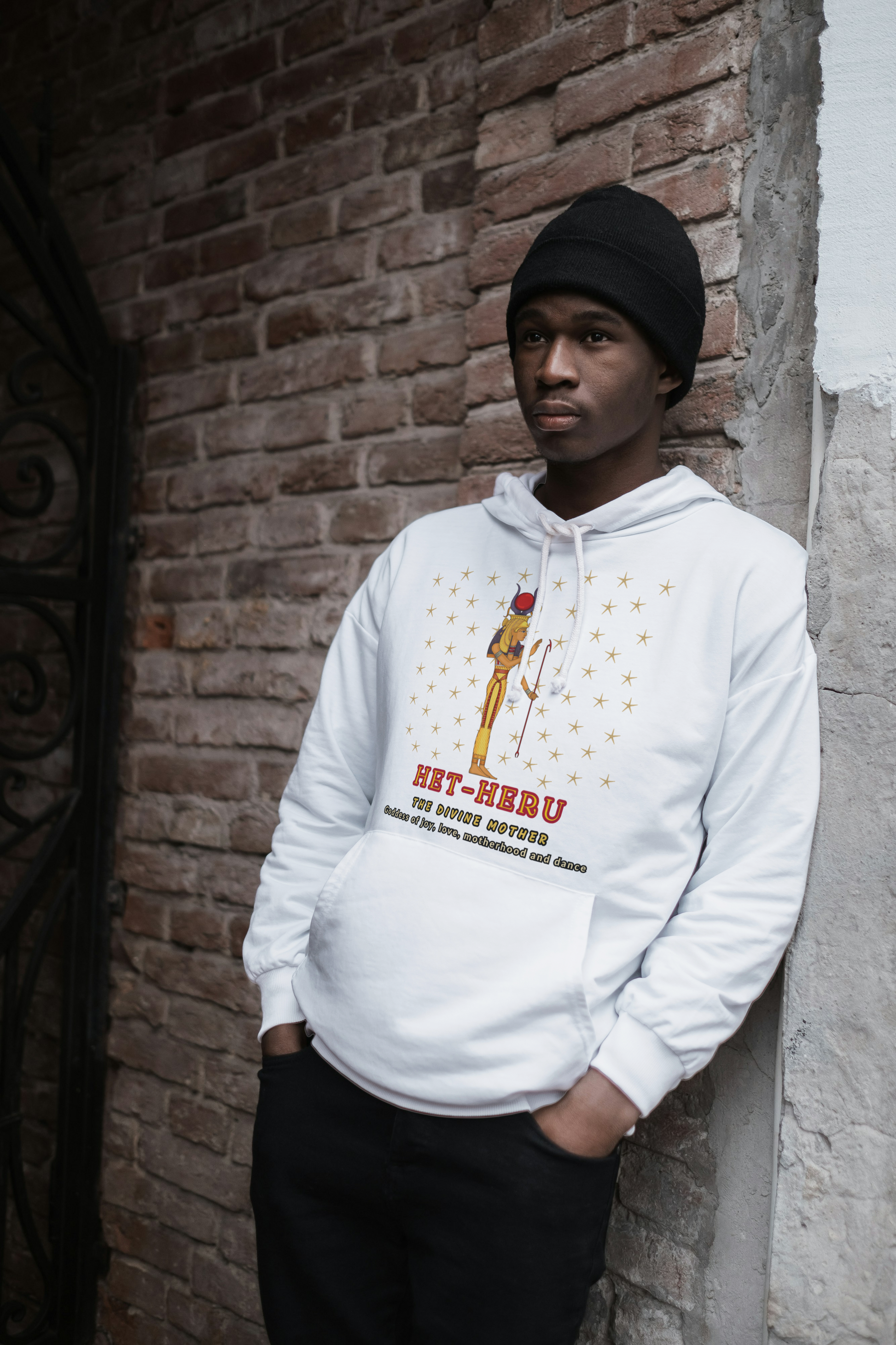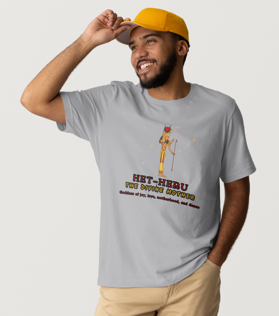 Description: Printed graphic design of Het-Heru holding the Was Scepter (a symbol of power, dominion, and divine authority) in one hand and the other hand raised in the position of blessing to send the life force energy (the Sekhem) out; has Seba stars in background. Meaning of her name: The Divine Mother. Known as: Goddess of joy, love, motherhood and dance