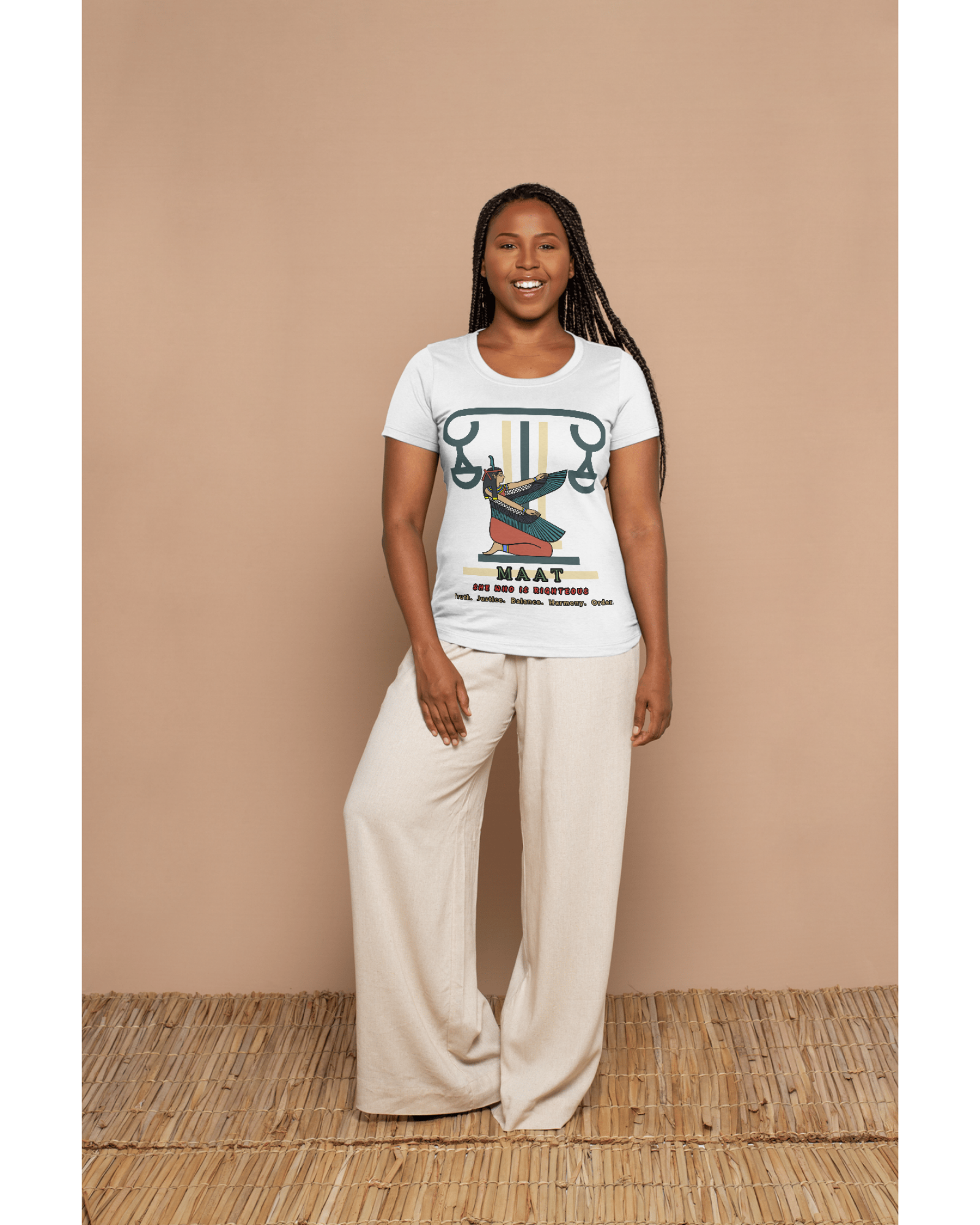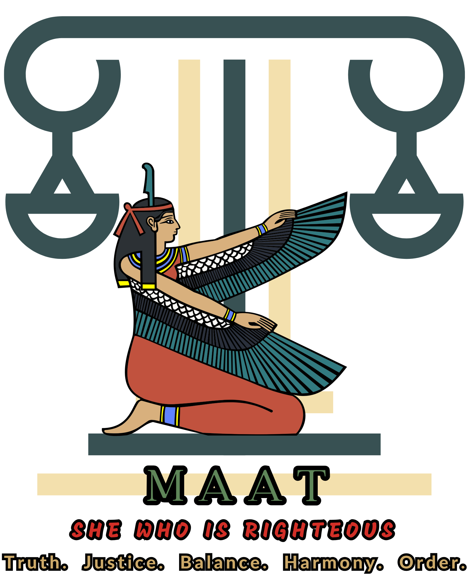 Description: Printed graphic design of the Neter, Maat kneeling on a scale. Name: Maat. Meaning of name: She who is righteous. Represents: truth, justice, righteousness, balance, harmony, and order. Pronounced: Ma - ought