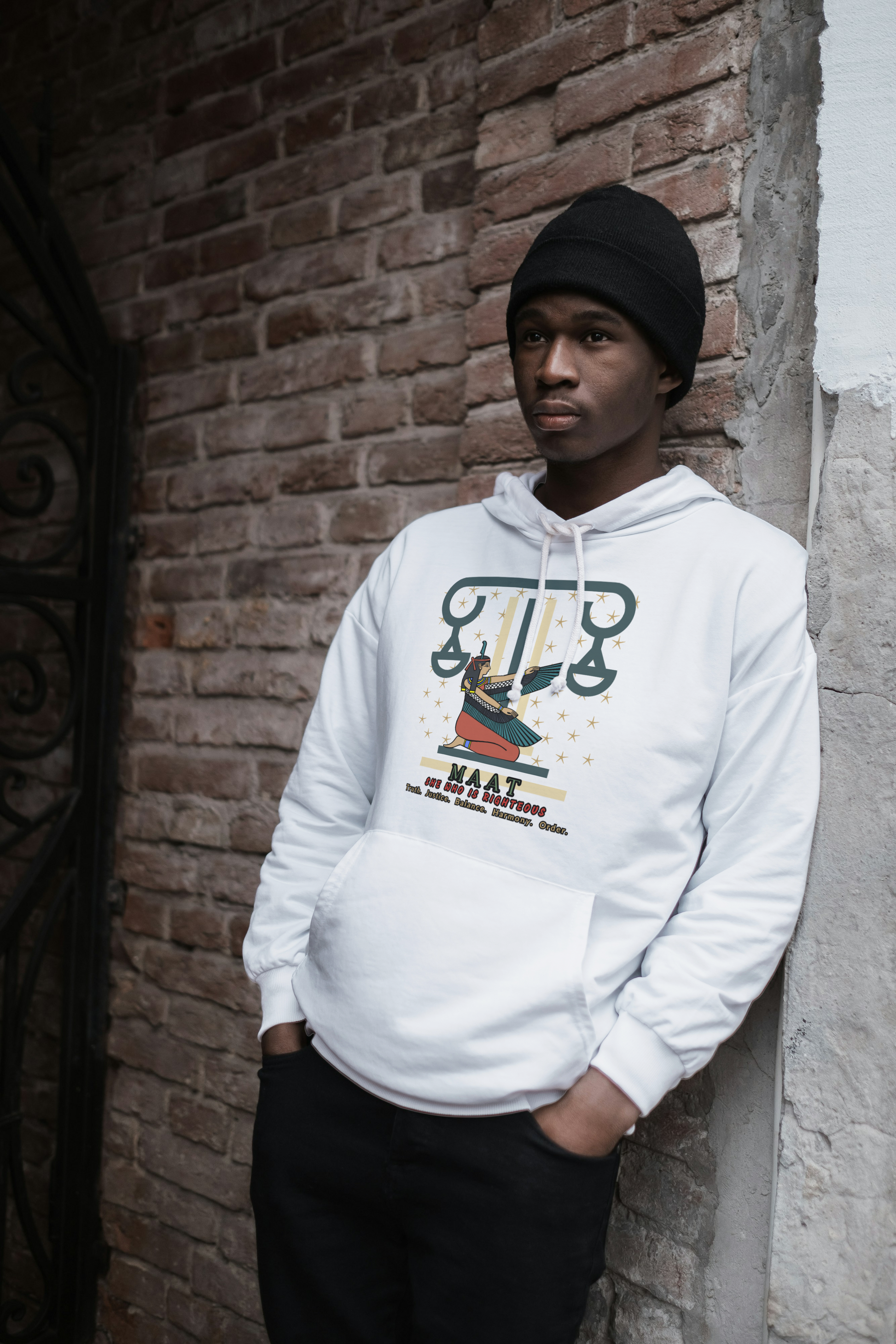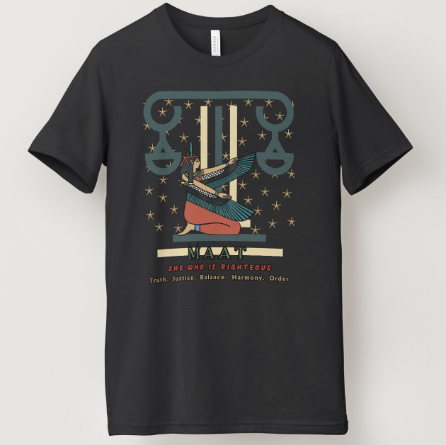 Description: Printed graphic design of the Neter, Maat kneeling on a scale with Seba stars background. Name: Maat. Meaning of name: She who is righteous. Represents: truth, justice, righteousness, balance, harmony, and order. Pronounced: Ma - ought