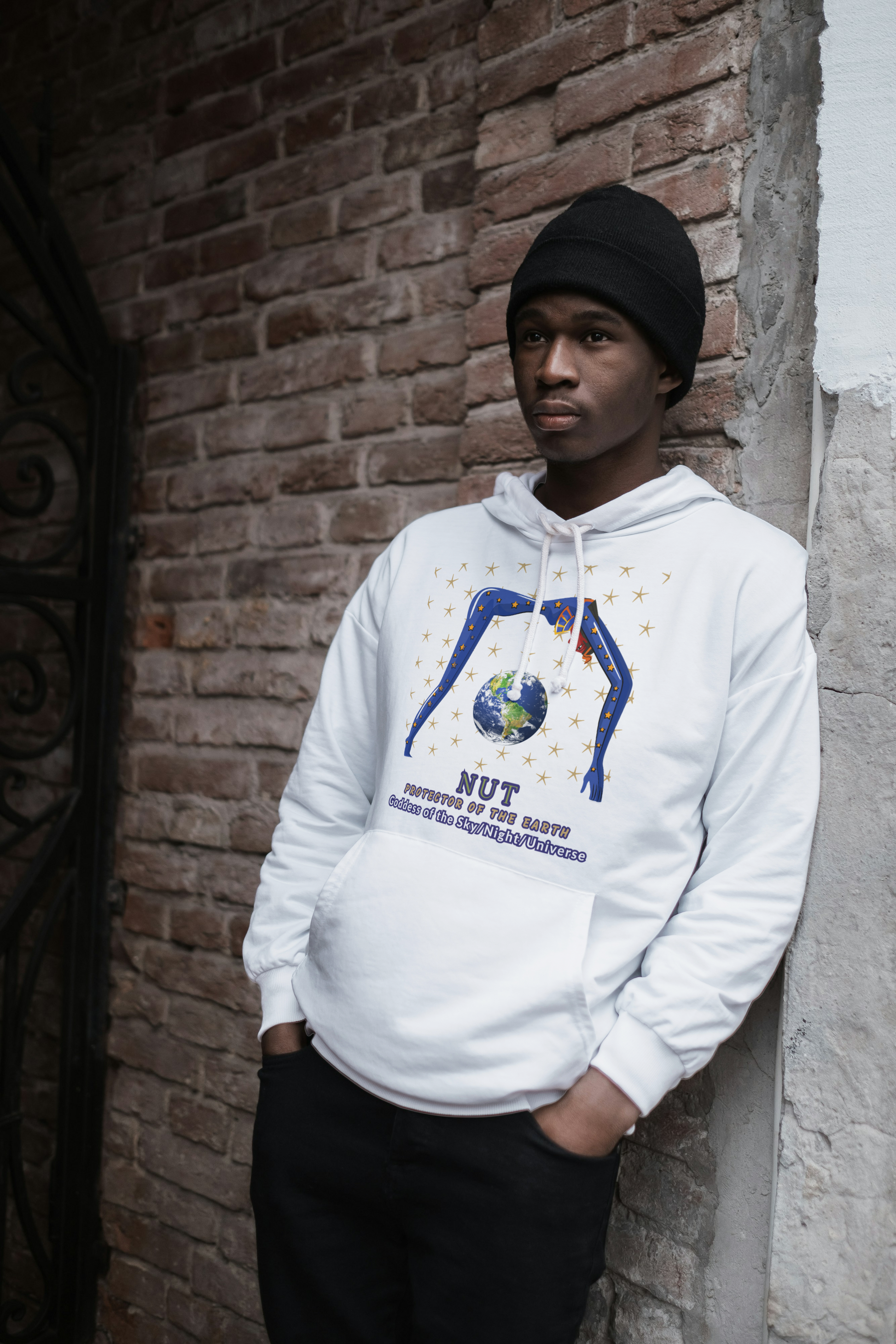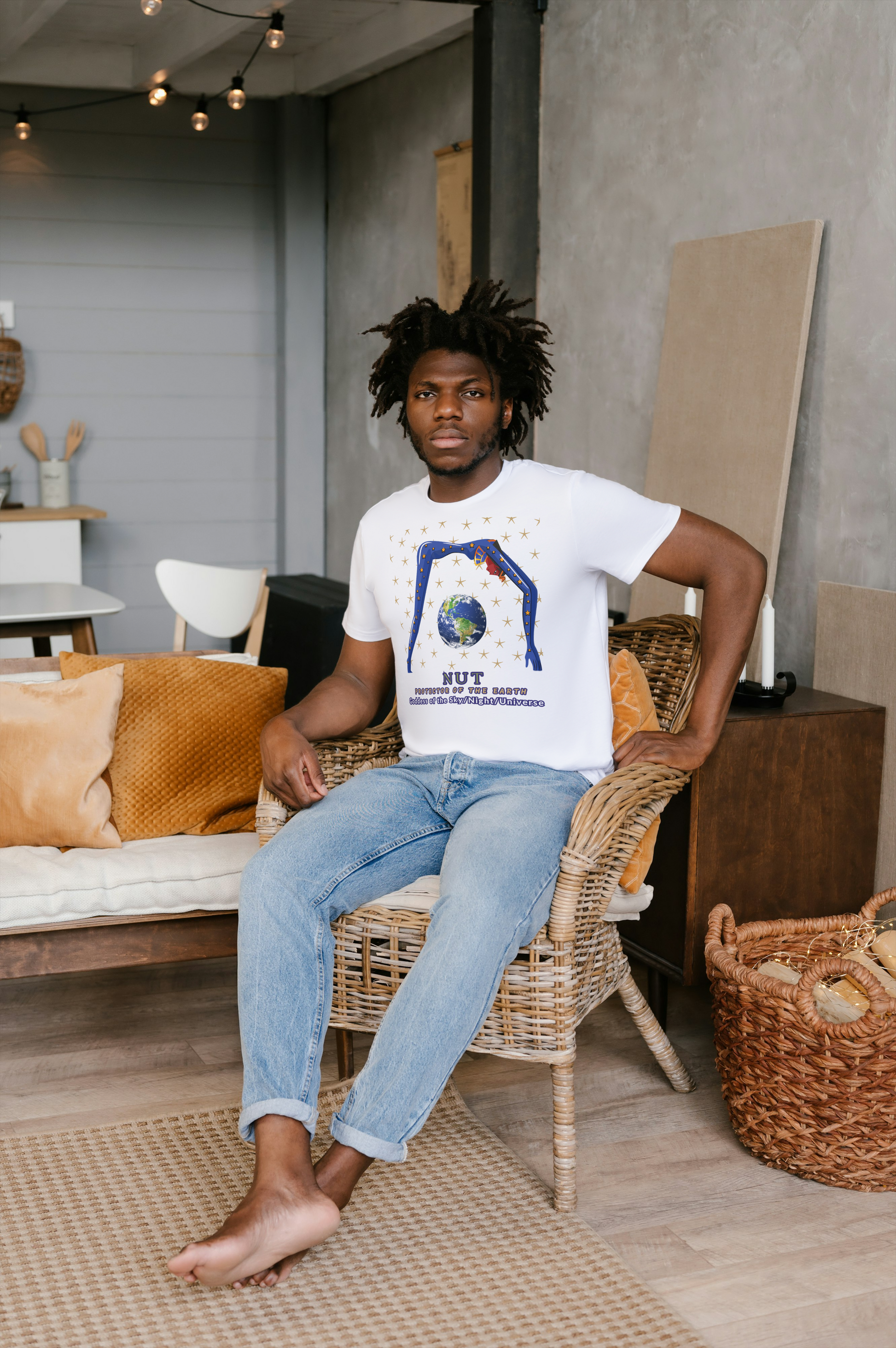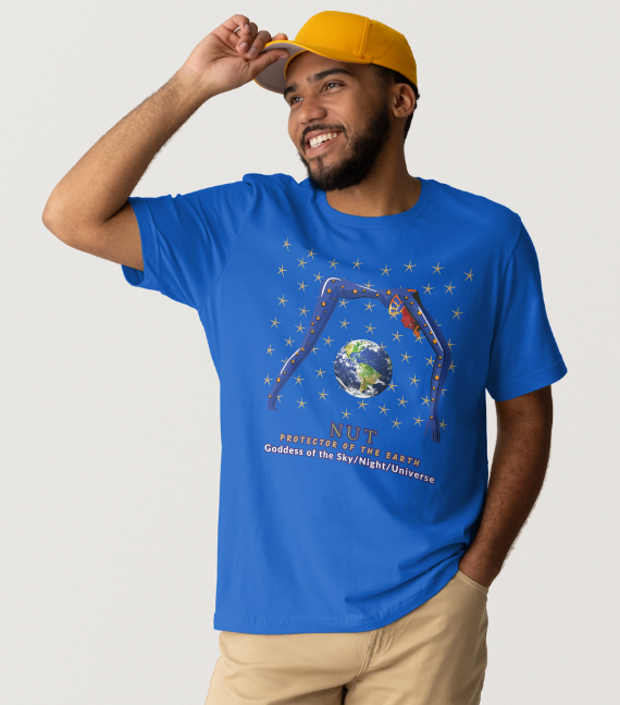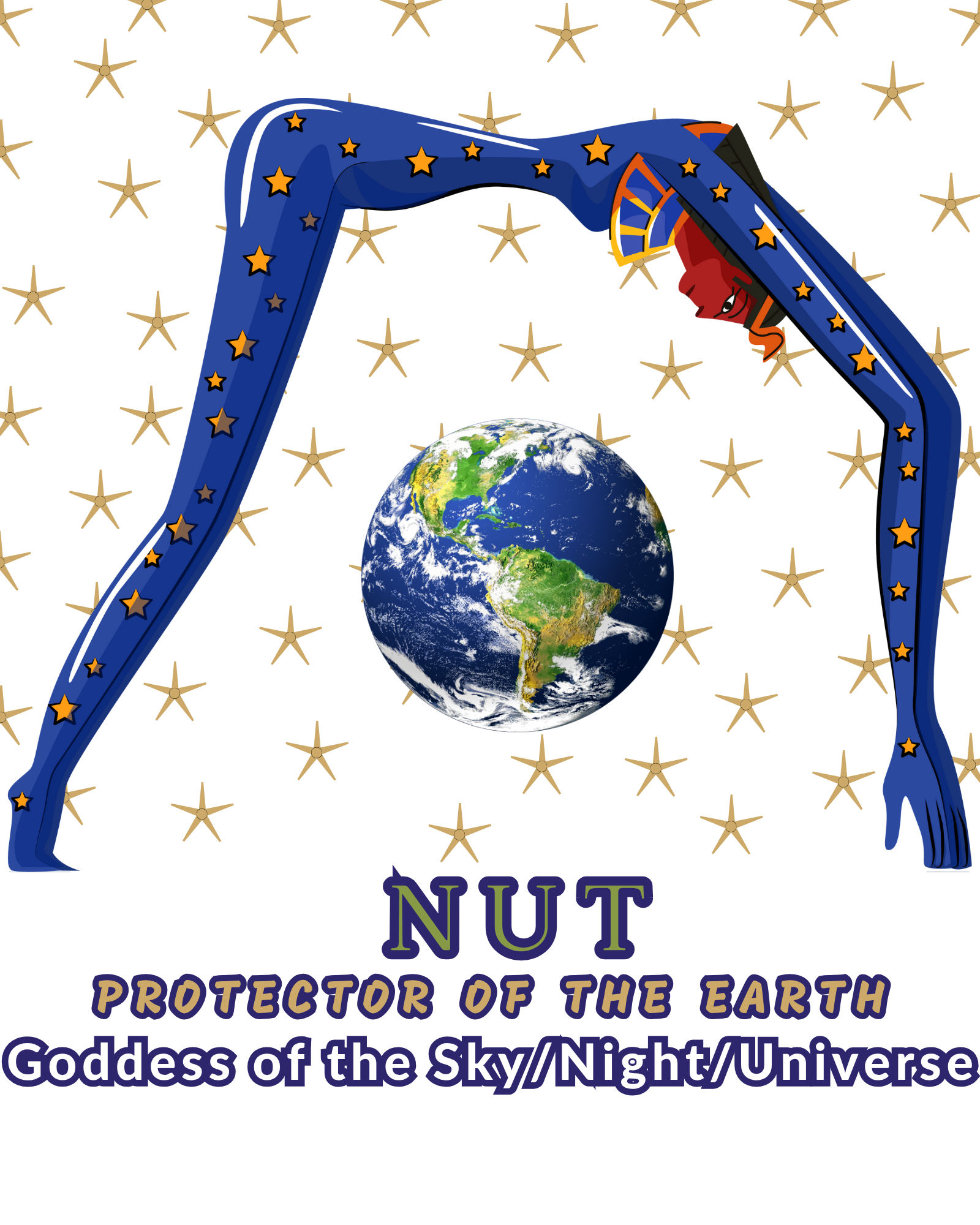 Description: Printed graphic design of the Neter, Nut hovering around the earth with Seba stars in background. Name: Nut Meaning: Protector of the Earth. Known for being: Goddess of the Sky/Night/Universe. Pronounced as "Noot".
