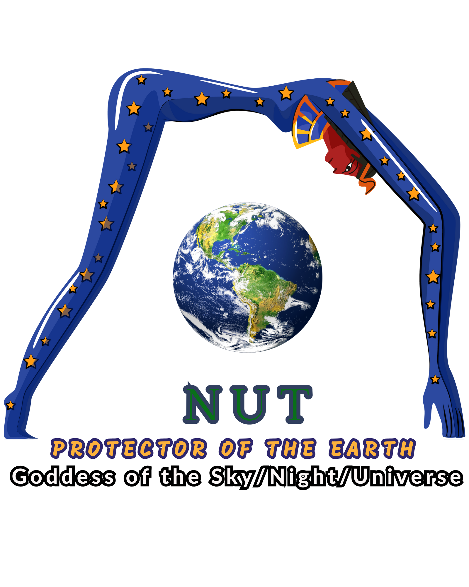 Description: Printed graphic design of the Neter, Nut hovering around the earth. Name: Nut Meaning: Protector of the Earth. Known for being: Goddess of the Sky/Night/Universe. Pronounced as "Noot".