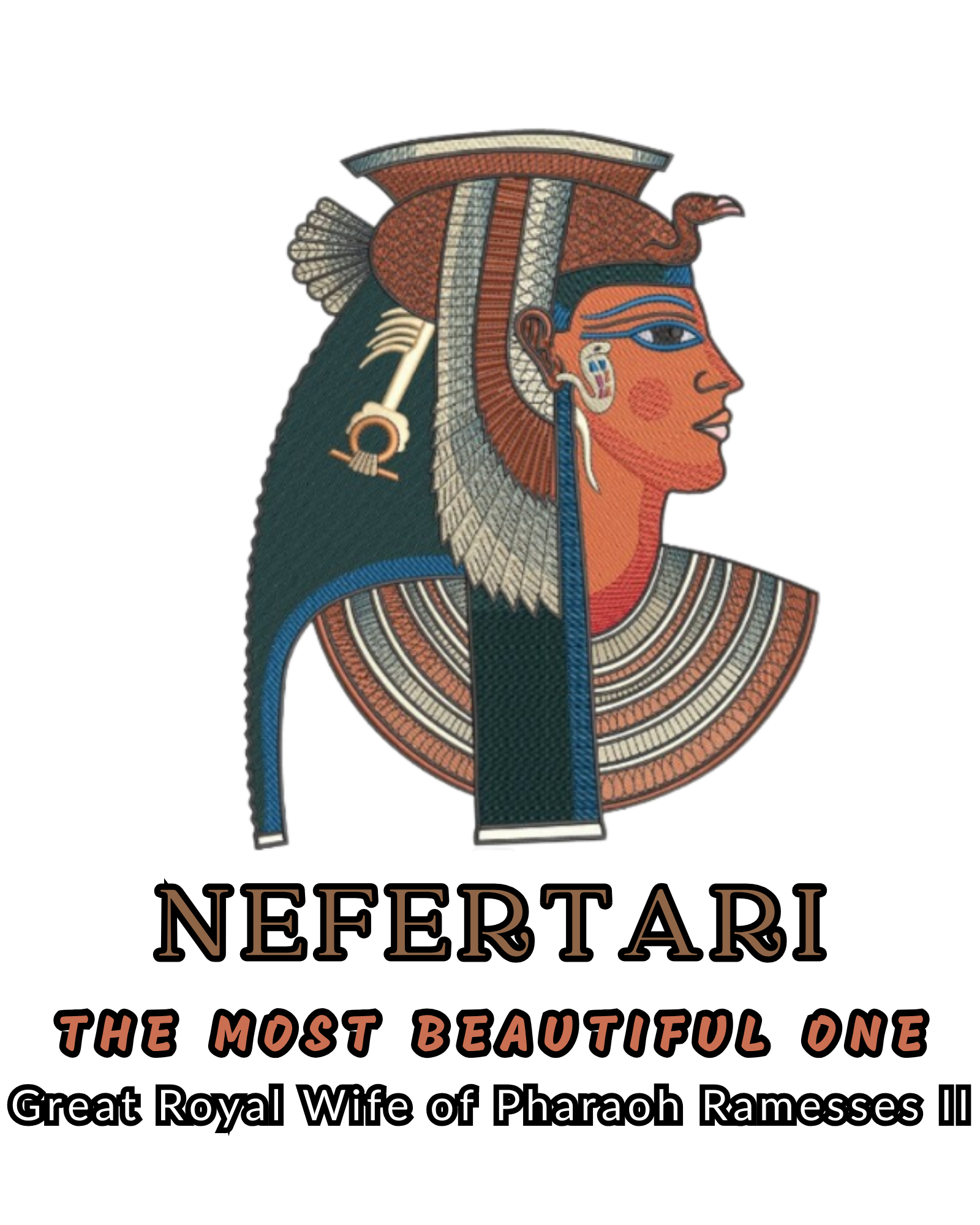 Description: Printed graphic design of Queen Nefertari. Meaning of her name: The Most Beautiful One. Know for: She was the great royal wife of Pharoah Ramesse II of Kemet's 19th Dynasty.