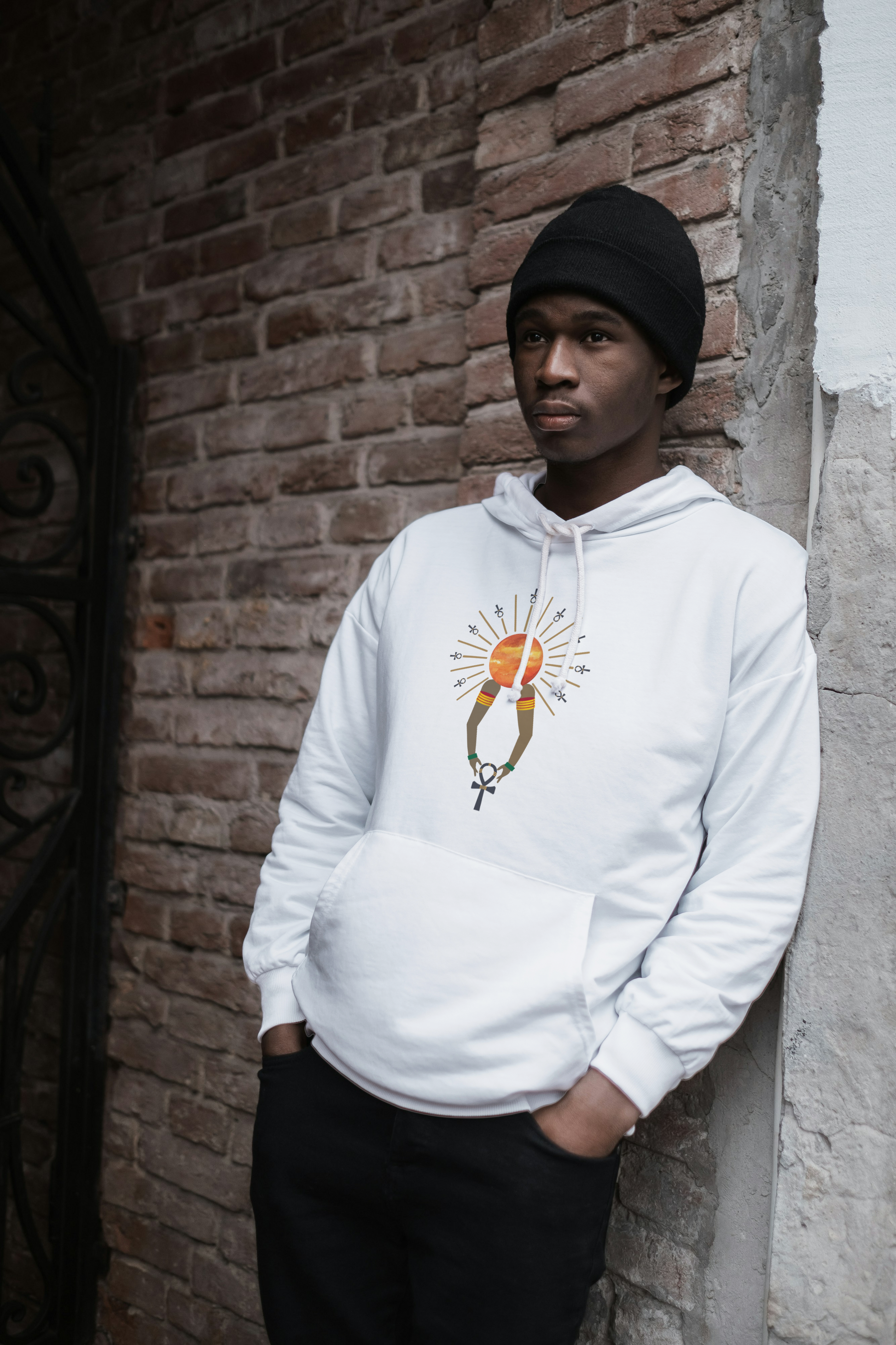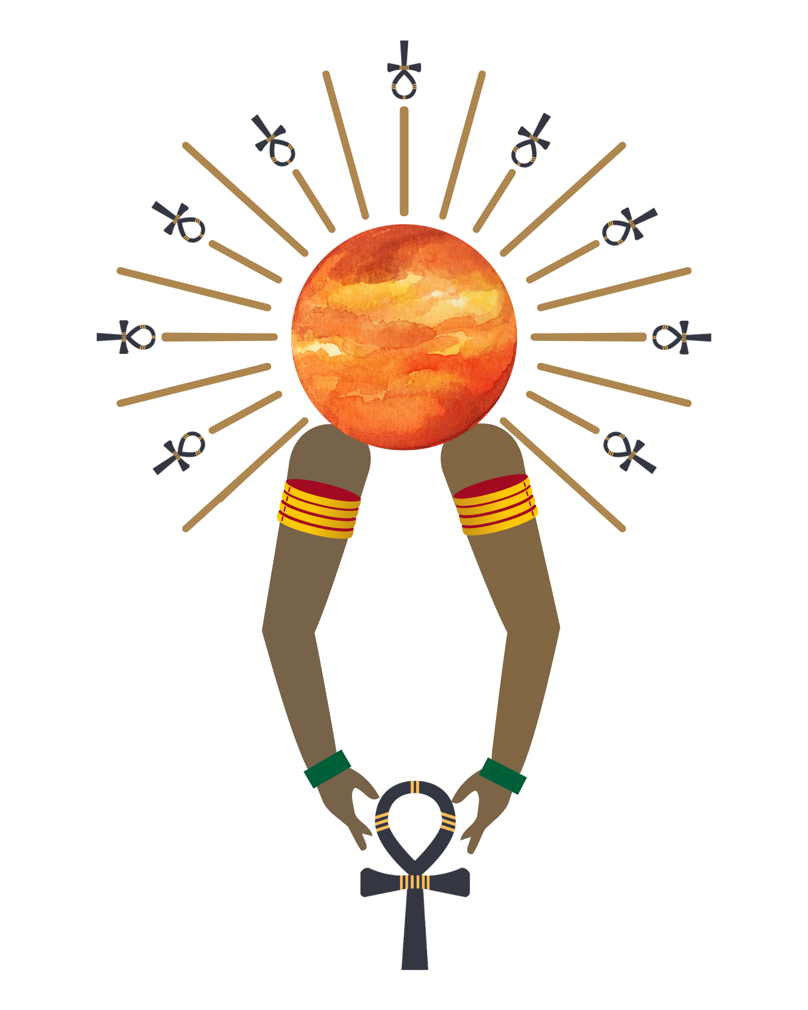 Description: Printed graphic design of the sun (a representation of the Neter Ra) with rays and arms extending from it. Has an Ankh (that represents life) at the end of each sun ray and in the hands.
