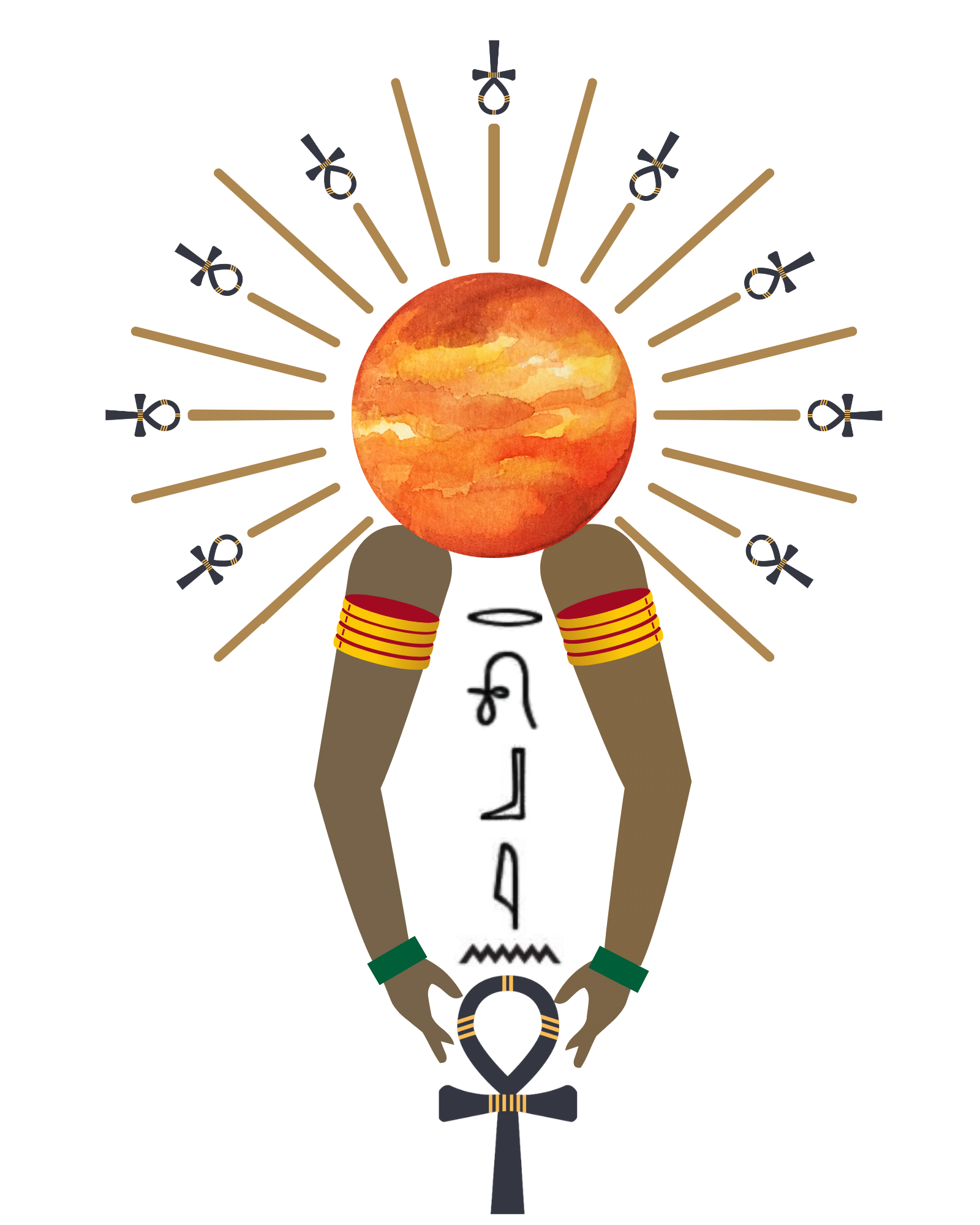 Description: Printed graphic design of a one of our signature Shenus (Kemetic Royal Seal). Image has the sun (a representation of the Neter Ra) with rays and arms extending from it. Has an Ankh (that represents life) at the end of each sun ray and in the hands.